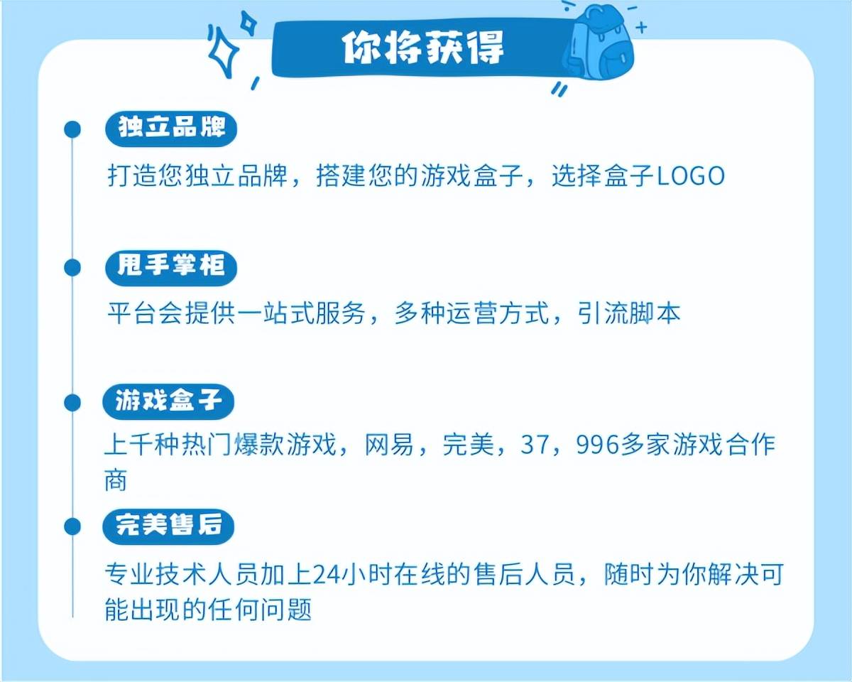 悍刀互娱十分体贴的将手游代理的技术门槛降低到最舒服的程度。代理商要做的只是想出一个响亮的品牌名字,平台会提供一站式服务,做一个名副其实的“甩手掌柜”。成为悍刀互娱手游代理后,拥有自己的品牌标识和玩家归属权,新游戏可以根据需要添加到游戏盒子中,并且享受定制开发功能服务,后面的新版本也能免费更新。