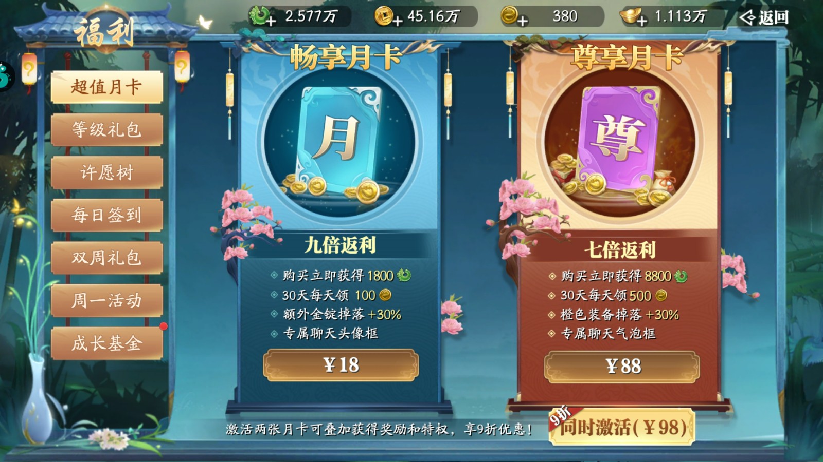 游戏策划更直接把充值优惠直接嵌入游戏,让你不必再为游戏不平衡担忧;无论是购买灵玉还是走狗道具,或者是激活活动,一律5折的优惠,再5折基础之上再给您做10倍的充值卡。