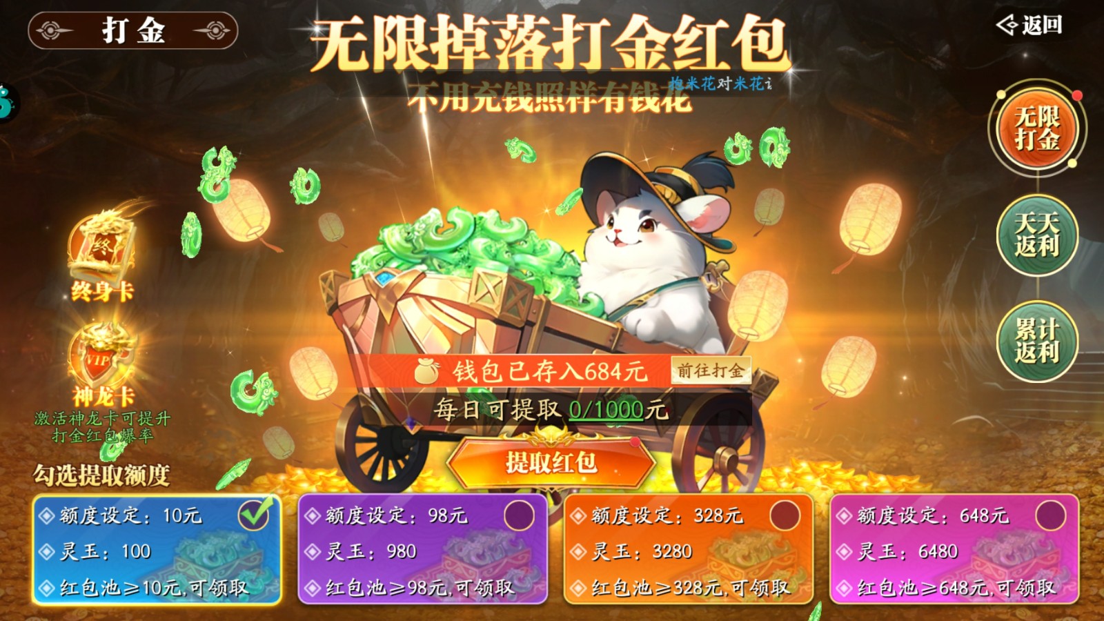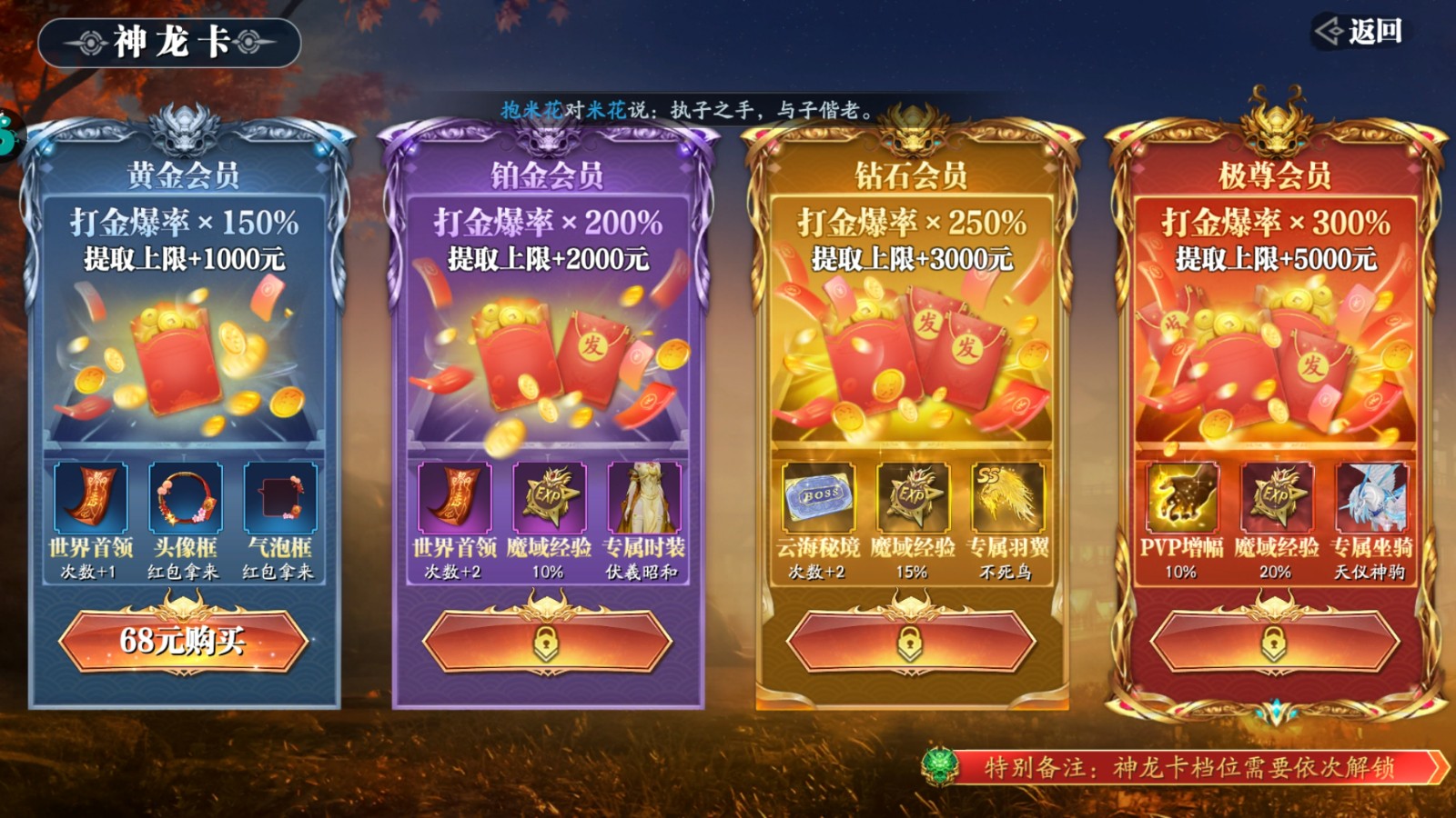 2.2 神龙卡:黄金会员34 珀金会员64 钻石会员164(参考个人消费标准) 极尊会员324(参考个人消费标准) 分别增加每日获取打金上线1000+2000+3000+5000