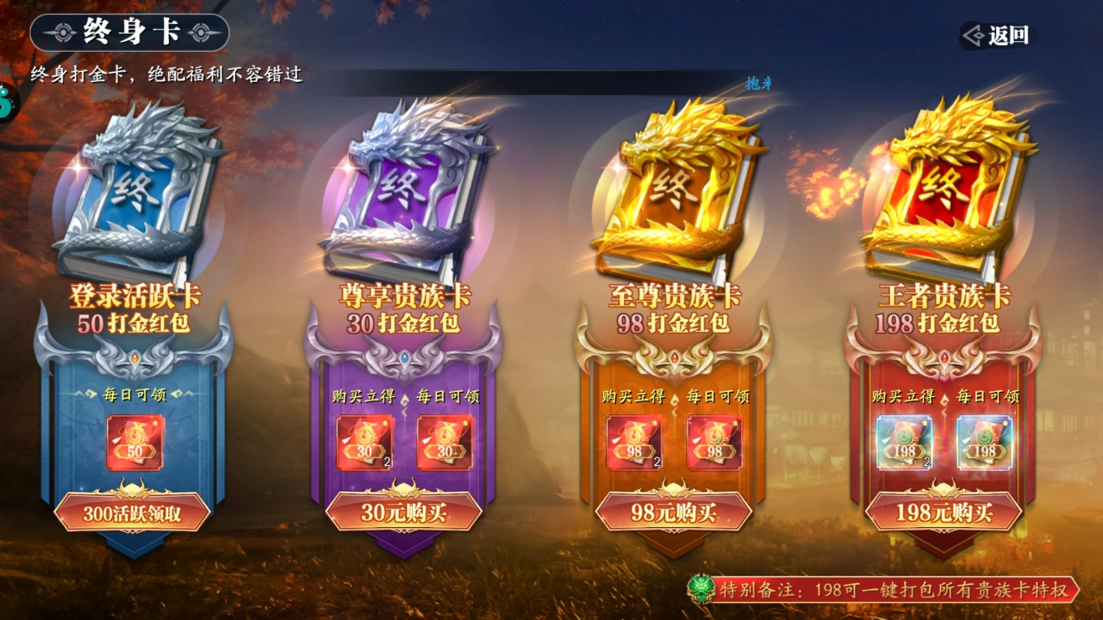2.1 终身卡:每日领取红包累计376;一键打包购买贵族卡99元即可激活,每日领取全部红包;开通首日还能额外领取652的红包