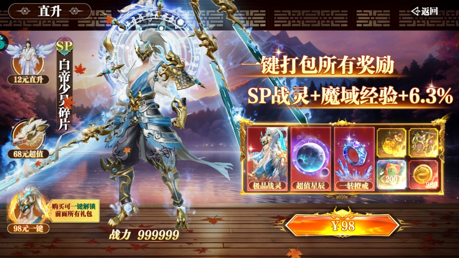 1 直升活动,只需49元即可激活,活动领取SP战灵、橙色装备、龙币等等一应俱全.